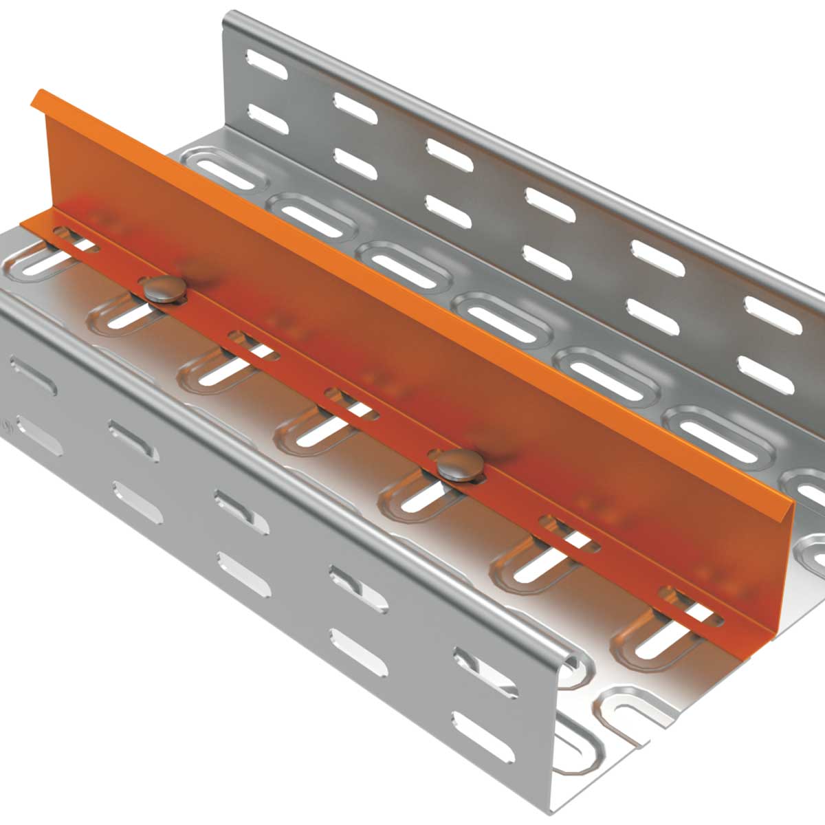 The connection is performed using the bolts NSM 6X10, 2 pcs per 1 meter. The partition is used to separate cables in cable trays. In term of electrical compatibility, it is also used for dividing several types of lines. It is recommended to use covers for this type of installation and make the covered and shielded room.